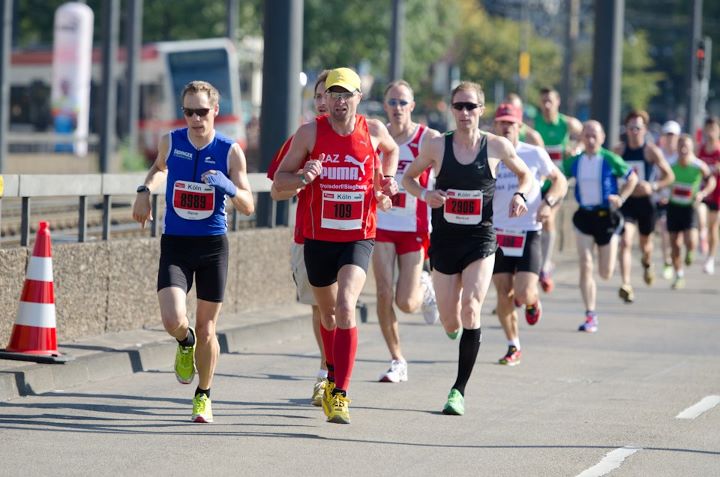 … gut und lange überlegt, leider noch mit Gipsschiene (aber man beachte -> passend zu den Vereinsfarben) und dann hatte auch der Sommer plötzlich bei ca 29°C seinen späten Auftritt, erfolgte der Start zum Köln Marathon erst mittags um 11:30 in Köln. Gute Bedingungen fühlen sich anders an!