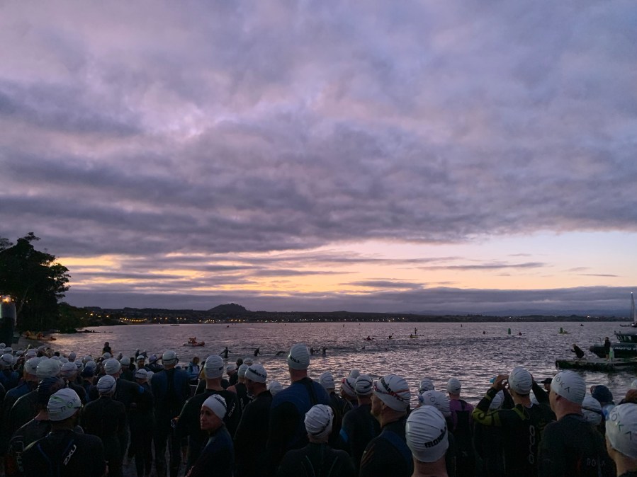 Start was in the dark with illuminated buoys after the traditional Māori Haka dance prelude on the beach. With maximum power over the 90 km I was not really compatible with my road bike but it was fun and some guys with their tri bikes where surprised to be overtaken by a road bike. But most of the time I found myself somewhere in the race field …but not where I expected myself to be.