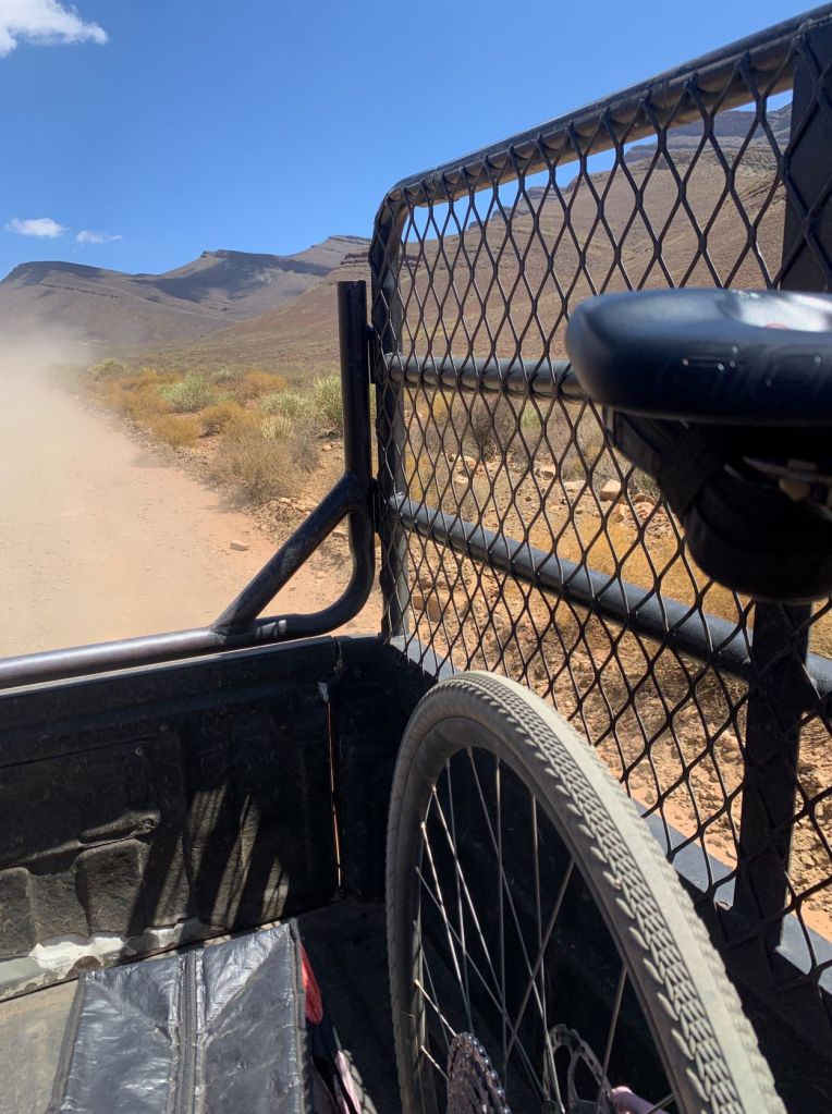 Es war so steil und wieder mal feinkörnig, dass ich mit meiner Minimalübersetzung 1:1 (40er Blatt vorne und 40 Zähne hinten) grad noch hochkam. Gisa hinter mir war dann irgendwann weg und rutschte durch. Anhalten ging für mich nicht, so wartete ich oben nach dem etwa 650 Höhenmeter Anstieg und wartete und wartete. Die Straßen waren so voller Querrillen (corrugated ist das passende englisch Wort dafür), dass wir den Luftdruck schon nahezu auf null hatten, aber ein Gravelbike ist halt kein vollgefedertes MTB. Jedenfalls kam dann oben auf dem Pass ein Land Rover Pick-up angefahren und hinten drauf saß Gisa mit ihrem Gravelbike. Sie hatte die an dem Tag beste Zwischenlösung gefunden. „You wanna have a lift?“ fragten mich die Südafrikaner Susa und George und ich hob das Rad auf den Pick-up und mich dazu. Er nahm uns für das unwegsamste Stück mit und donnerte mit 80 Sachen über die Schotterpiste, dass ich echte Schwierigkeiten hatte, stehend hinten drauf mich und das Rad zu halten. How ever, das war eine gute Entscheidung, wir hätten es im hellen nicht mehr geschafft nach Wolseley zu kommen (das war der erste Ort, in dem man einen vernünftigen Schlafplatz finden konnte). George setze uns dann irgendwann ab und von dort hatten wir nur noch etwa 2,5 Stunden Fahrt vor uns.