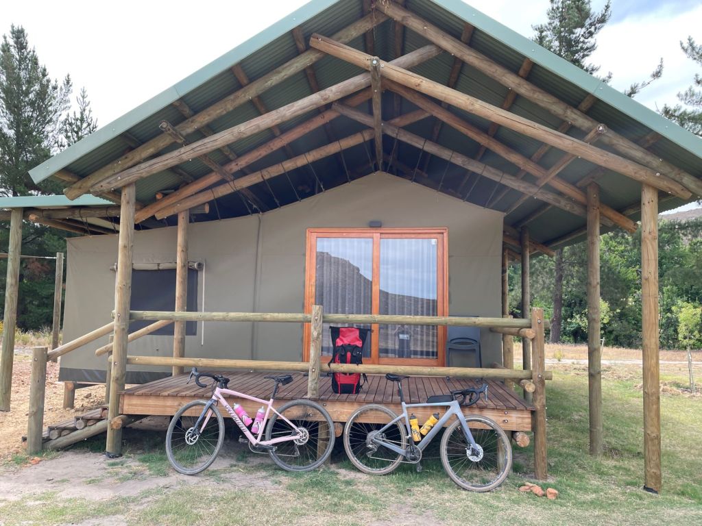 Am ersten Tag führte es über unsere mittlerweile Hausstrecke über den Chapman’s Peak Drive (man sagt, es sei eine der schönsten Küstenstraßen der Welt – unterschreibe ich sofort!) bis nördlich hinter Kapstadt. Bis hierhin gab es noch keine Gravelpisten, durch Kapstadt durch ist es immer etwas hektisch, aber dem lässt sich mit der High-Speed Busspur entgehen. Eine rot-farbige Busspur ausschließlich für Schnellbusse, die sich auch gut mit dem Rad fahren lässt, nur darf man die Busse nicht behindern und muss sofort Platz machen. Auch Tag 2 war noch recht harmlos, deshalb konnte wir auch ordentlich Kilometer machen mit etwa 1.000 Höhenmetern. Der Tag endete in Koringberg, ziemlich remote in einer kleinen Unterkunft bei einem Italiener, der hier hin ausgewandert ist. Wir wurden herzlich empfangen und bekamen sogar Joghurt mit frischen Früchten und ein Bierchen. Allerdings hatte ich an dem Tag mit den Devil Thorns zu kämpfen (eine Samenart mit drei harten spitzen, die den Fahrradreifen nie verfehlt). Weil ich immer noch nicht von Tubeless (also Reifen ohne Schlauch, dafür mit Dichtmilch) überzeugt bin, fahre ich Schläuche und flicke auch mit richtigen „Old style“ Flicken. Das funktioniert und ist technisch die beste und schnellste Lösung. Wobei ich sagen kann, dass es in Europa perfekt ist, aber in Südafrika durchaus Sinn macht, mit Dichtmilch zu fahren. Jedenfalls hatte ich abends den Schlauch mit drei (!) Flicken repariert, um dann noch ein viertes Loch zu finden – kein Flicken mehr da. Also weiter ohne Ersatz und hoffen, dass keine Dornen mehr kommen.
