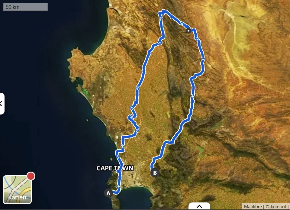 Start war in unserem Haus in Kommetjie (südlich von Kapstadt, Nähe Cape of Good Hope), dann Richtung Norden an Kapstadt vorbei in das Landesinnere zu den Zedernbergen und von dort bis nach Stellenbosch (dort hatten wir schon einen Monat geplant und einige berufliche Termine standen auch an). Insgesamt 6 Tage, 550 km und etwa 5.600 Höhenmeter im Aufstieg lagen vor uns, Terrain unbekannt. Es sollte heiß und trocken werden.